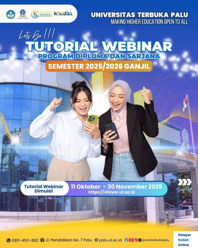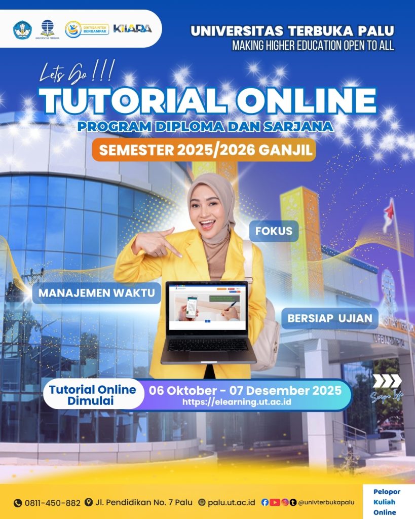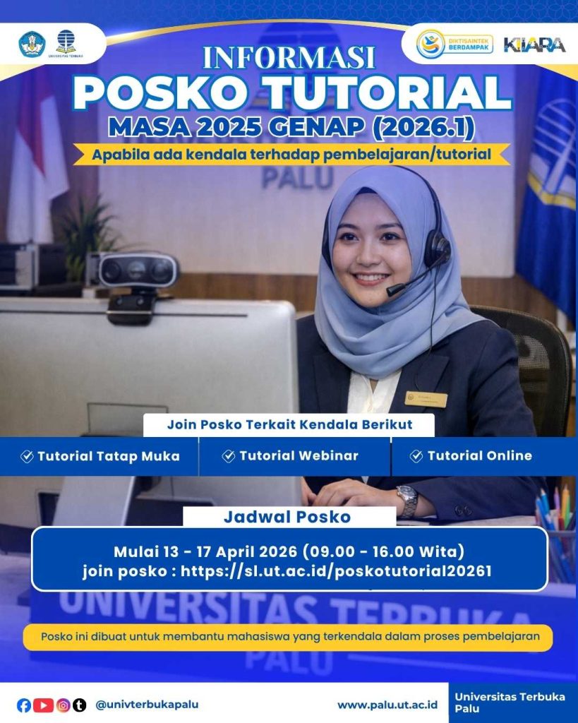 Dalam rangka mendukung kelancaran proses pembelajaran mahasiswa, disediakan Posko Tutorial yang dapat dimanfaatkan oleh mahasiswa yang mengalami kendala selama mengikuti kegiatan tutorial. Posko ini hadir sebagai layanan bantuan untuk berbagai jenis tutorial, baik secara langsung maupun daring. Layanan Posko Mahasiswa dapat bergabung sesuai dengan jenis kendala yang dihadapi: Tutorial Tatap Muka Tutorial Webinar Tutorial Online Jadwal Pelaksanaan Tanggal: 13 – 17 April 2026 Waktu: 09.00 – 16.00 WITA Akses Posko Tutorial dapat bergabung melalui tautan berikut: https://sl.ut.ac.id/poskotutorial20261 Tujuan PoskoPosko ini dibuat untuk membantu mahasiswa yang mengalami kendala dalam proses pembelajaran/tutorial, sehingga kegiatan belajar dapat berjalan dengan lebih lancar dan efektif. Untuk informasi lebih lanjut, kunjungi: https://www.palu.ut.ac.id Media sosial: @universitasterbukapalu Jadwal Tutorial Webinar dan Tutorial Online