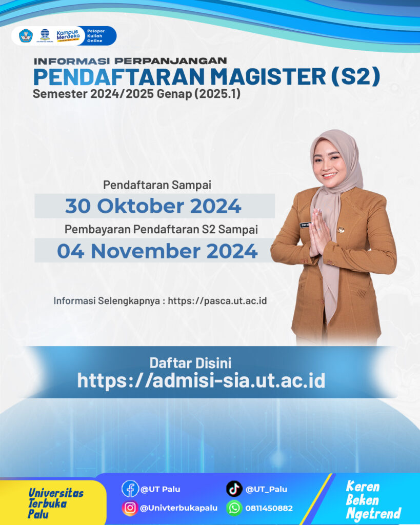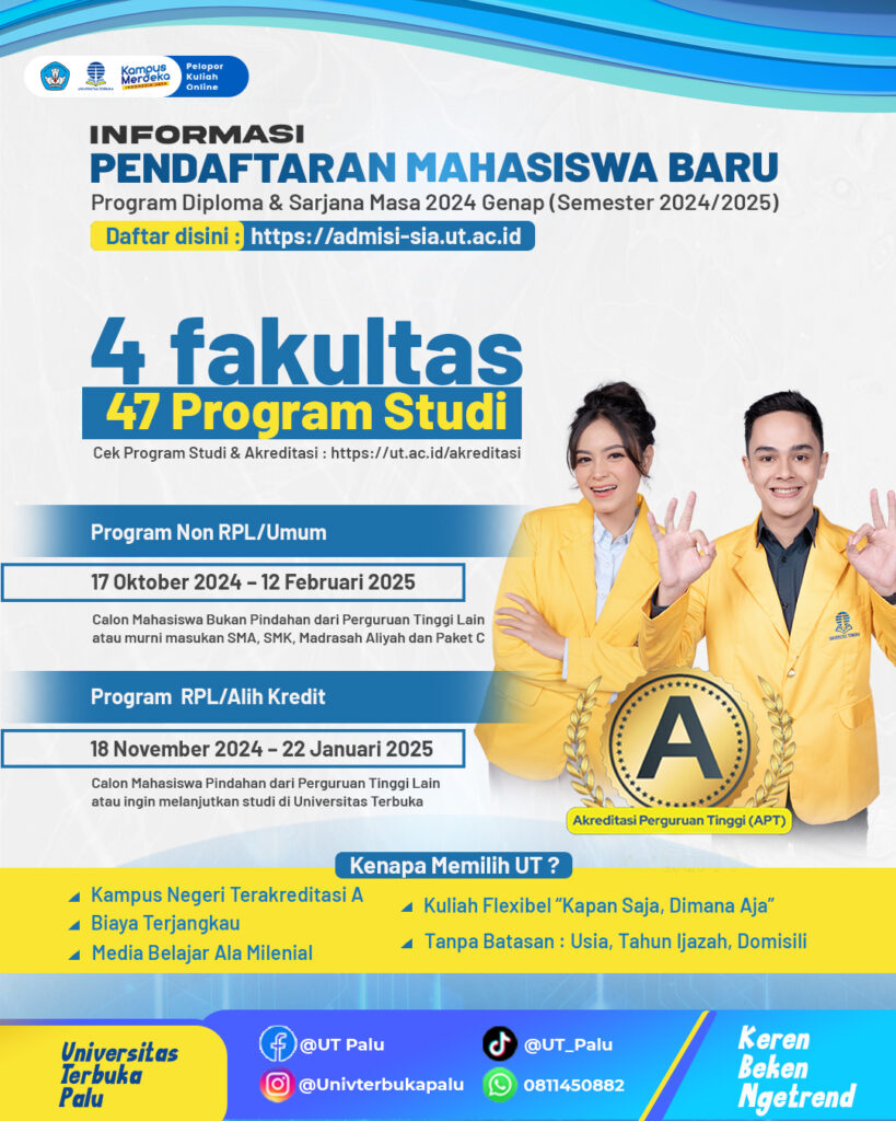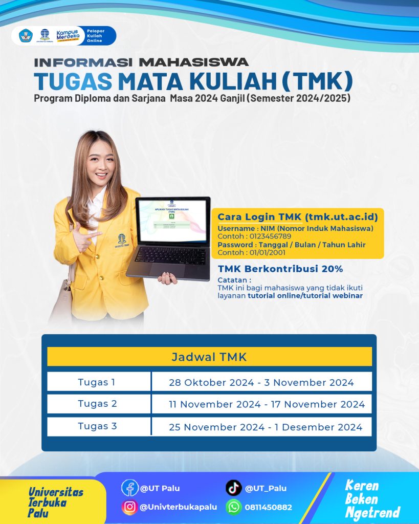 Sobat UT Palu, Tugas Mata Kuliah (TMK) telah dimulai yuk akses (https://tmk.ut.ac.id) program Diploma dan Sarjana masa 2024 Ganjil (semester 2024/2025) Bagi sobat UT Palu yang tidak mengikuti Tutorial Online/Tutorial Webinar manfaatkan TMK ini yang bisa membantu 20% dalam hasil akhir ujiannya yah Cara login Username : NIM (Contoh : 0123456789) Password : Tanggal Lahir/Bulan Lahir/Tahun Lahir Apabila ada kendala hubungi 0811450882 Salam Universitas Terbuka Palu