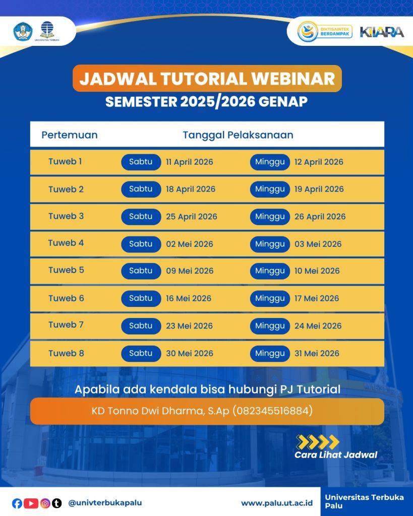 💬 Hubungi Ibu Elsi Mariani (PJW Luwuk Banggai & Banggai Laut) 💬 Hubungi Ibu Tita Tri Sulistyorini (PJW Morowali dan Morowali Utara) 💬 Hubungi Pak KD Tonno Dwi Dharma (PJW Kota Palu) 💬 Hubungi Kak Virgiawan (PJW Poso dan Tojo Una-Una) 💬 Hubungi Pak Rezky Abditaska (PJW Toli-Toli dan Buol) 💬 Hubungi Ibu Fitriani Lestari(PJW Sigi dan Banggai Kepulauan) 💬 Hubungi Ibu Zahra Ningsih (PJW Parigi Moutong dan Donggala)Jenis Tutorial di Universitas Terbuka